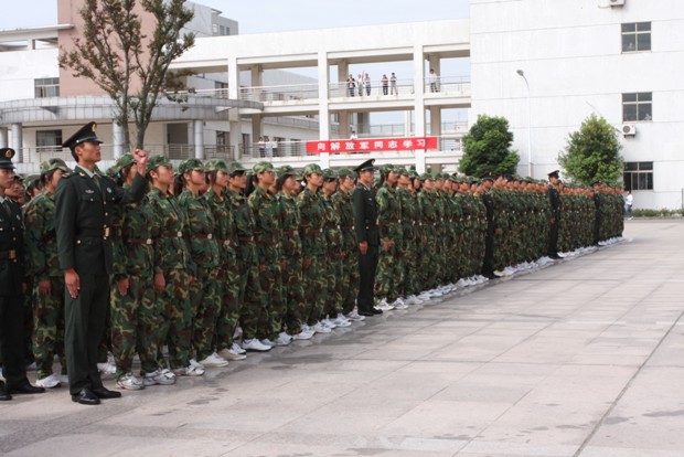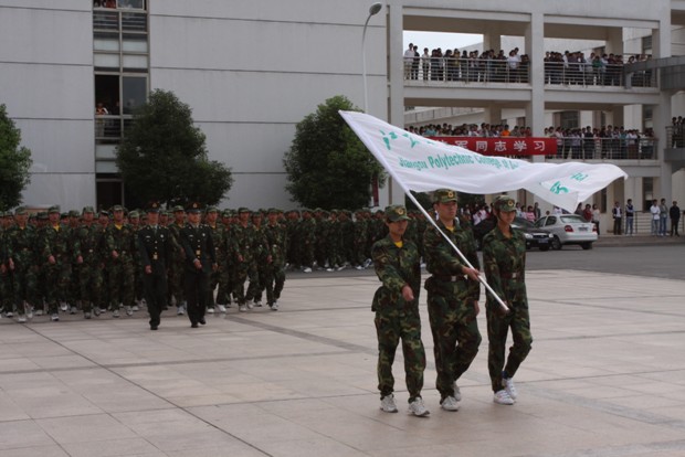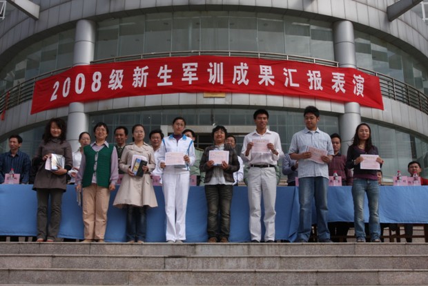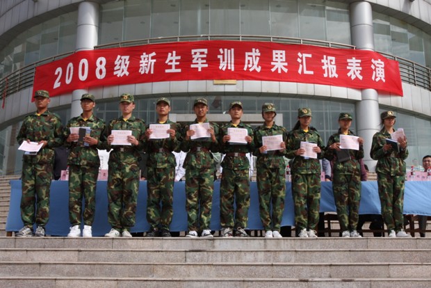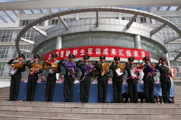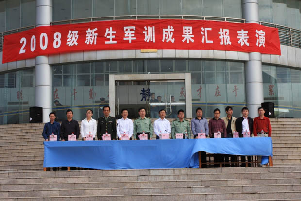 随着雄壮的国歌声响起,2008级新生军训汇报表演拉开帷幕。“同学们好!”“首长好“,“同学们辛苦了”!“为人民服务”!……伴随着铿锵有力的阅兵进行曲,院长黄焱、副院长苏小冬在郑仲品副司令、严荣务副部长和张志刚副部长的陪同下检阅了2008级新生军训方队。同学们以严整的军容、威武的军姿、响亮的口号接受了院领导的检阅。分列式时各方队精神饱满、步伐整齐、口号响亮;男生方队的军体拳表演和女生方队的队列表演博得了一阵阵热烈的掌声。