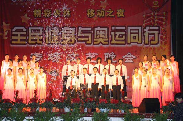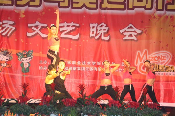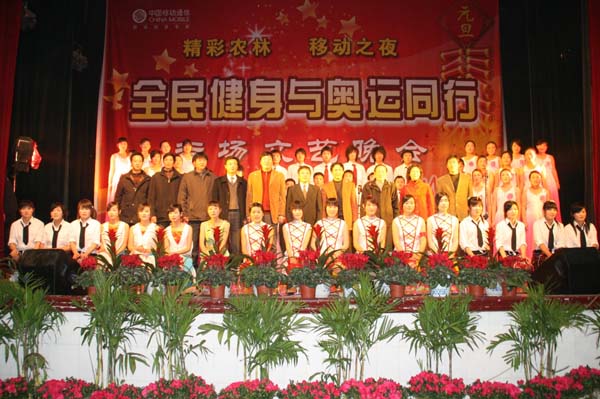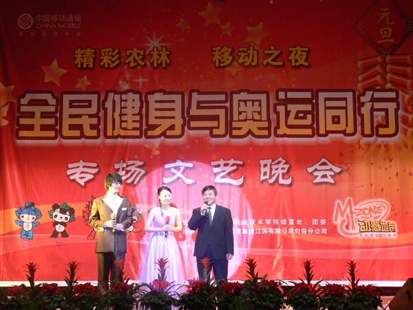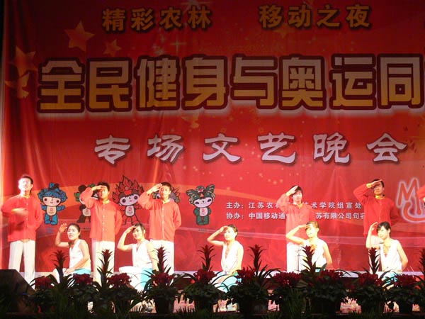 载歌载舞欢度佳节,同心同德再创辉煌。2007年12月28日晚,学院体育馆内张灯结彩、歌舞飞扬、暖意融融。由学院组宣处、团委共同举办的“精彩农林、移动之夜——全民健身与奥运同行”2008年元旦大型文艺晚会在此隆重举行。本次晚会适逢江苏省第六届农民运动会乒乓球、投篮、象棋三项比赛在永利官网成功举行,一台充满青春活力和节日喜庆、洋溢着和谐与欢乐的迎新春元旦晚会在这里精彩上演,将欢庆2008新年到来和喜迎奥运的喜庆氛围精彩呈现。
