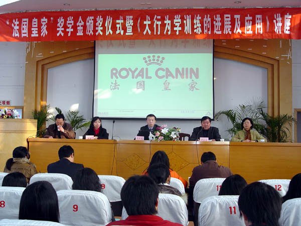12月15日,我系“法国皇家奖学金”颁奖仪式在永利官网九楼会议室隆重举行。学院尹汉学院长出席仪式,并对法国皇家科技交流部中国区经理马生友先生及主管李莲女士的到来表示热烈欢迎。尹汉学院长及马生友先生亲自为获奖同学颁发证书和奖学金,获奖代表刘青青同学发言,对皇家宠物食品公司领导表达了诚挚的谢意。最后,马生友先生做了专题讲座——《犬行为学训练的进展及应用》,同学们受益匪浅。