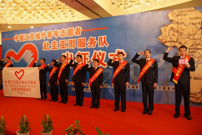 5月30日上午,中国江苏援外青年志愿者赴圭亚那服务队出征仪式在南京隆重举行。共青团中央书记处书记卢雍政、商务部副部长魏建国出席仪式并讲话,江苏省委常委、宣传部部长孙志军出席仪式并为服务队授旗,出征仪式由团省委书记魏国强主持。