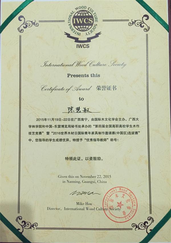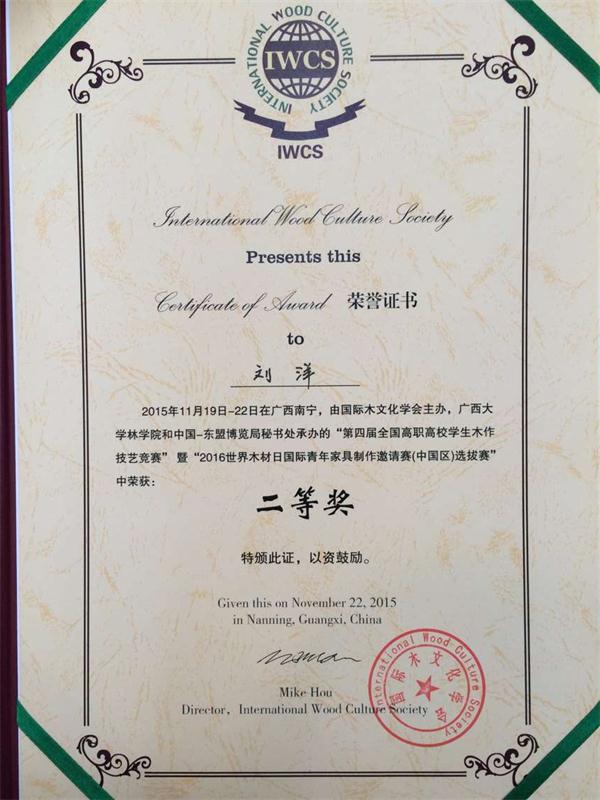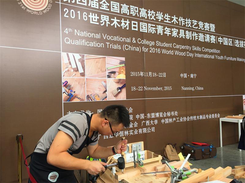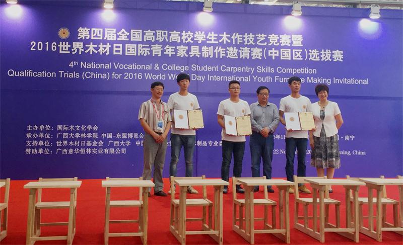 11月18—22日,由国际木文化学会主办的“第四届全国高职高校学生木作技艺竞赛”暨“2016世界木材日国际青年家具制作邀请赛(中国区)选拔赛”在广西南宁国际会展中心举行。本届竞赛主题是幼儿实木家具制作,要求参赛选手在28小时内按规定图纸手工制作完成作品,永利官网风景园林系13家具设计与制造专业刘洋同学以第三名的优秀成绩荣获二等奖,陈慧敏老师荣获“优秀指导教师”称号。 据悉,本届竞赛由国际木文化学会主办、中国-东盟博览会秘书处和广西大学林学院承办,旨在进一步弘扬中华传统木作文化、激发青年学生的创新潜能,吸引了来自北京林业大学、东北林业大学、南京林业大学、广西大学等多所高校学生参赛。