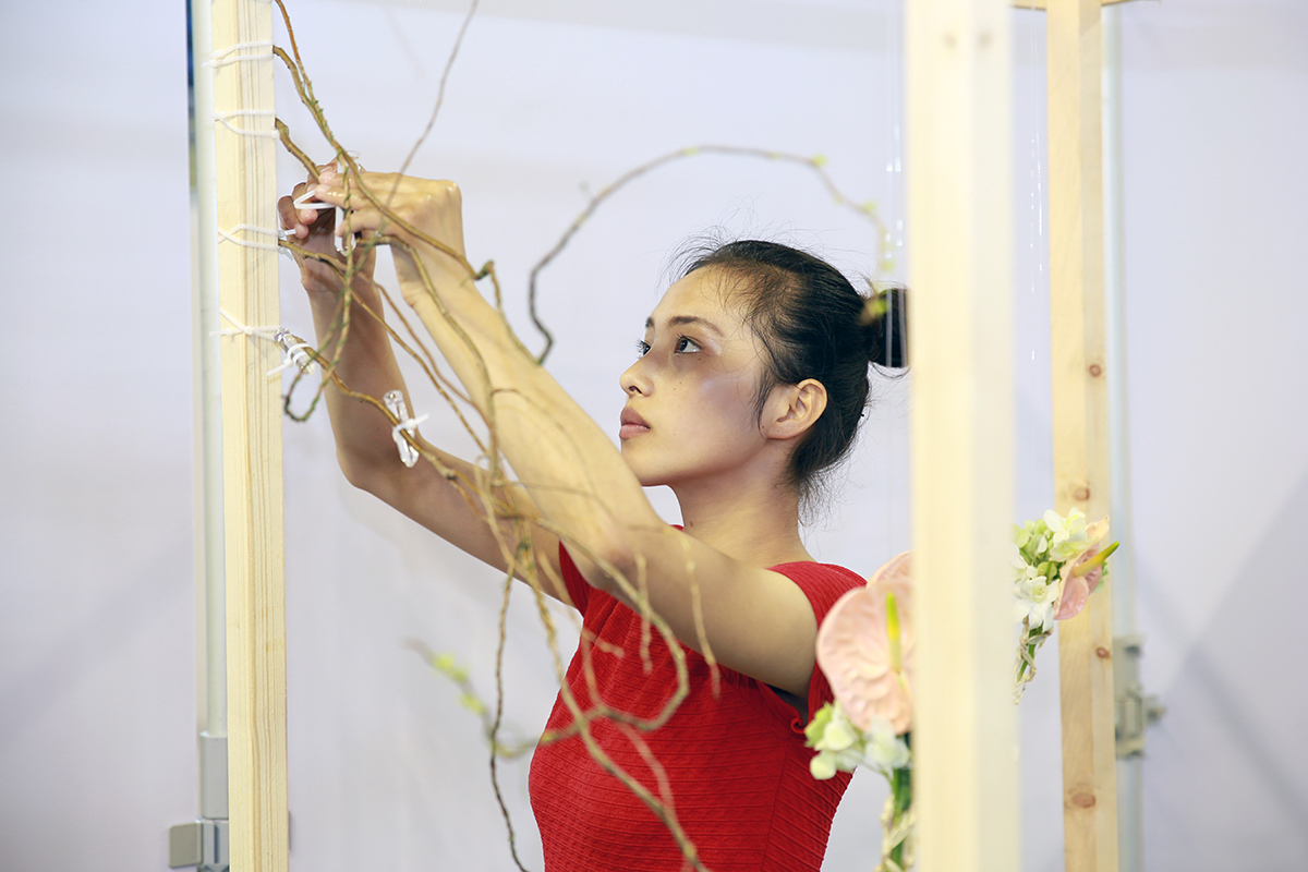 现场,来自全省各地的14名选手根据专家组赛前选定模块“自由命题花艺作品设计与制作”的形式要求,充分利用赛场所提供的花材和结构,大显身手,修剪、造型,再选搭合适的饰物,在180分钟内创造出各式各样构思巧妙、新颖别致的花艺作品。