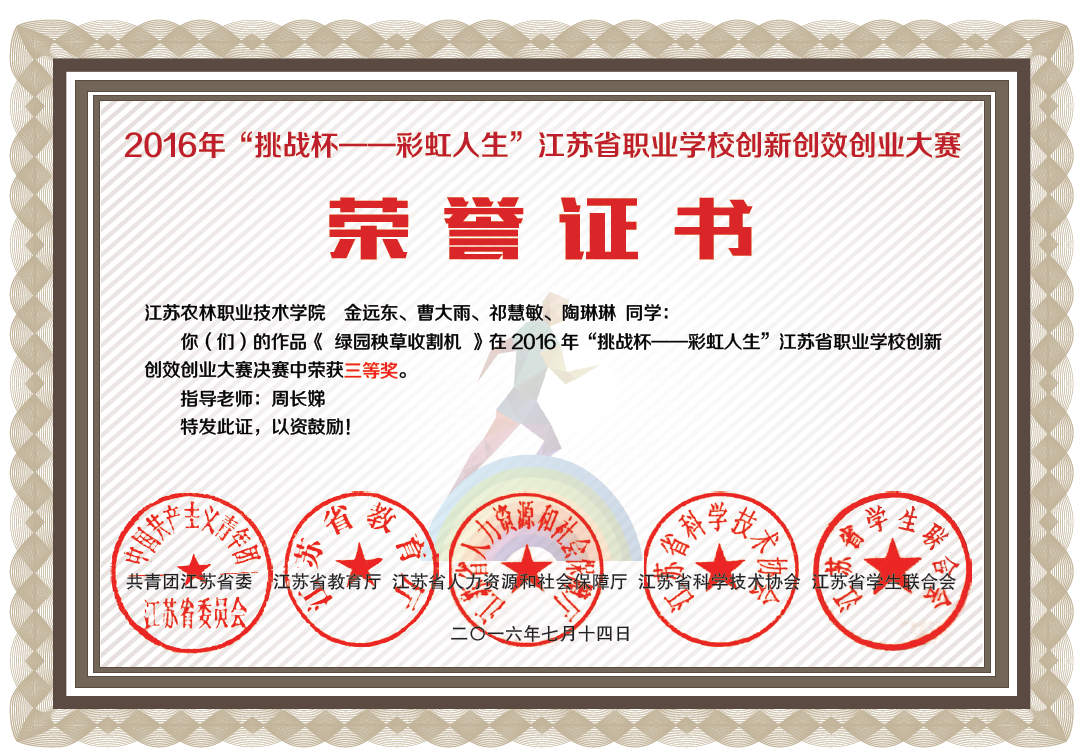 在今年5月举办的2016年“挑战杯——彩虹人生”江苏省职业学校创新创效创业大赛中,“基于物联网精准灌溉施肥”作品荣获全省一等奖并成功入围全国职业学校创新创效创业大赛,孙昌权老师荣获省赛“优秀指导教师”。此外,作品《绿园秧草收割机》荣获全省三等奖。