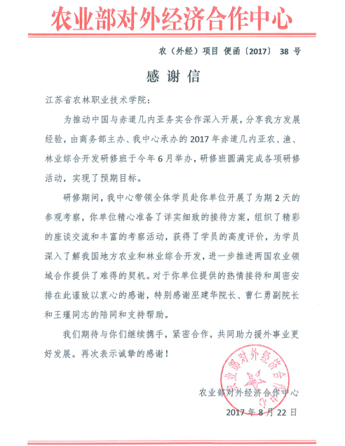 近日,农业部对外经济合作中心给永利官网发来感谢信,对永利官网的精心组织和周到安排表达感谢,并期待与永利官网继续携手,紧密合作,共同助力援外事业更好发发展。感谢信全文如下: