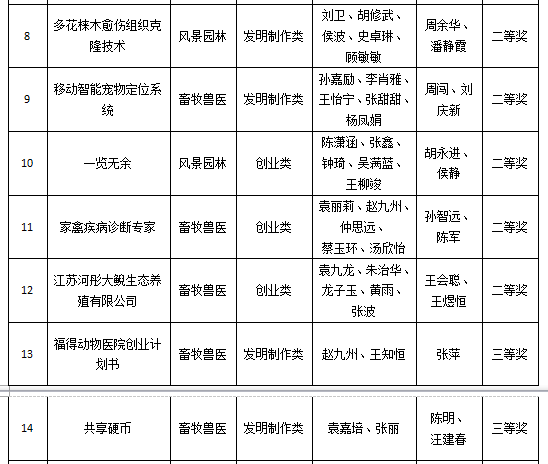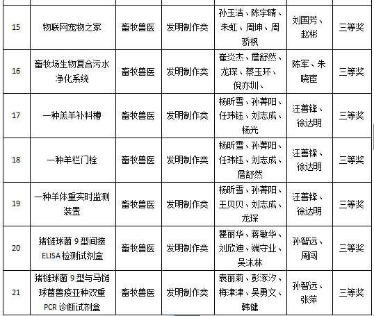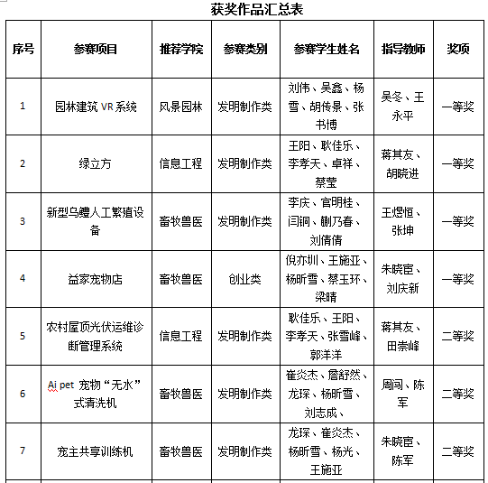 10月25至27日,第十二届全国高等职业院校“发明杯”大学生创新创业大赛在河南省许昌职业技术学院举行。我校选送了23件作品参加大赛,通过网上评审与现场答辩,共有21件作品脱颖而出,其中,风景园林学院《园林建筑VR系统》、信息工程学院《绿立方》和畜牧兽医学院《新型乌鳢人工繁殖设备》3件作品获得发明制作类一等奖,畜牧兽医学院《益家宠物店》作品获得创业类一等奖。信息工程学院《农村屋顶光伏运维诊断管理系统》、畜牧兽医学院《宠主共享训练机》等5件作品获得发明制作类二等奖,风景园林学院《一览无余》、畜牧兽医学院《家禽疾病诊断专家》等3件作品获得创业类二等奖。畜牧兽医学院《畜牧场生物复合污水净化系统》、《猪链球菌9型间接ELISA检测试剂盒》等9件作品获得发明制作类三等奖。我校吴冬、蒋其友、王煜恒、刘国芳、汪善锋等五名指导老师被评选为“优秀指导教师”,徐达明老师被评选为“组织工作先进个人”,我校也荣获“优秀组织奖”。