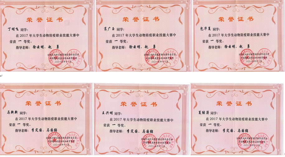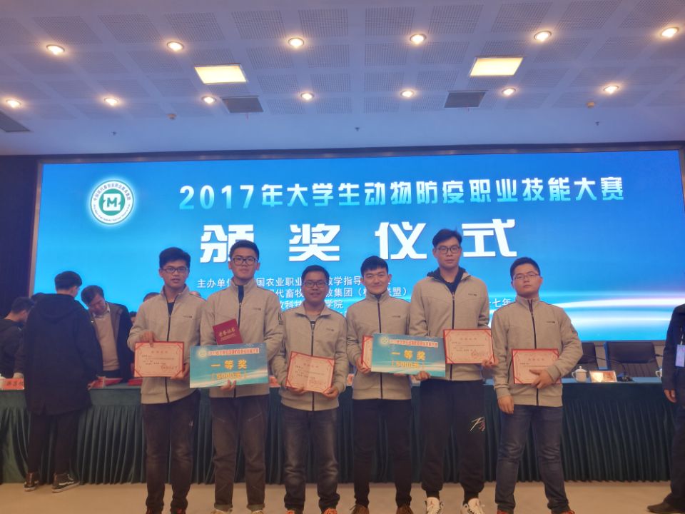 11月25日—26日,由全国农业职业教育教学指导委员会、中国现代畜牧业职教集团共同主办的2017年大学生动物防疫职业技能大赛决赛在江苏农牧科技职业学院举行。我校畜牧兽医学院选派的两支代表队葛广玉、丁明飞、包华夏(一队)、王兴明、夏继涛、马新新(二队)凭借扎实的理论知识及过硬的操作技术,一并斩获一等奖。徐云明、李定国、马国辅、赵勇四位老师获优秀指导教师荣誉。