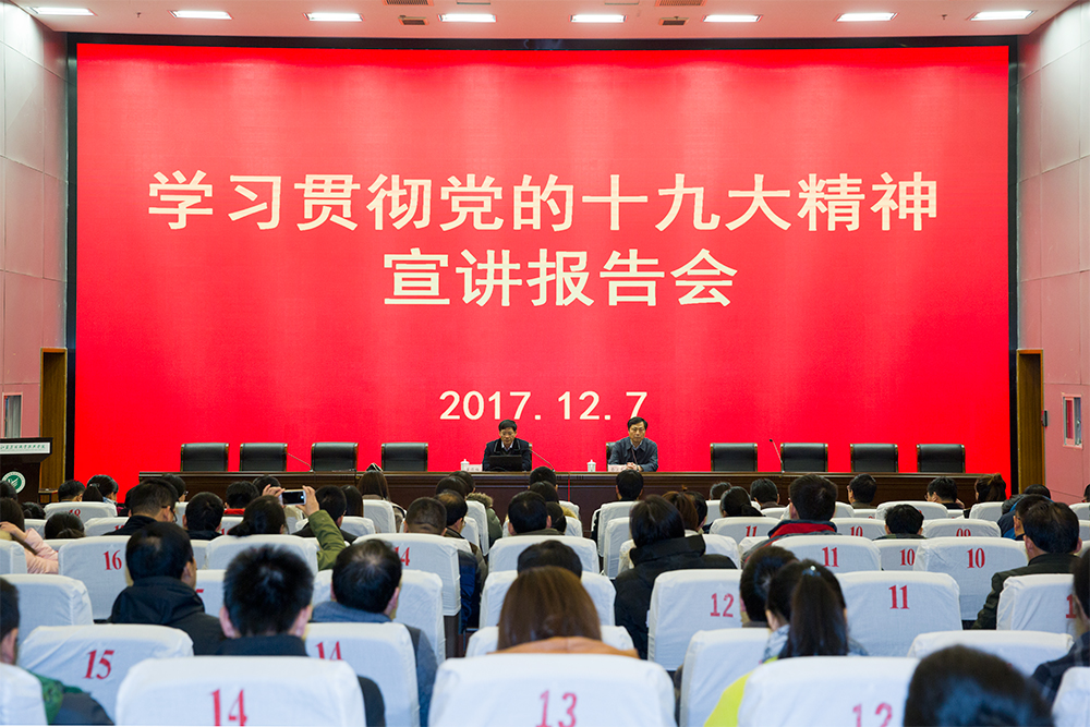 12月7日下午,我校学习贯彻党的十九大精神宣讲报告会在图书馆报告厅举行,江苏大学马克思主义学院院长董德福教授以《中国特色社会主义从“新”启航——十九大报告学习辅导》为题作宣讲报告。校党委书记俞卫东主持会议,在校领导班子成员、中层以上干部和全体党员参加了报告会。