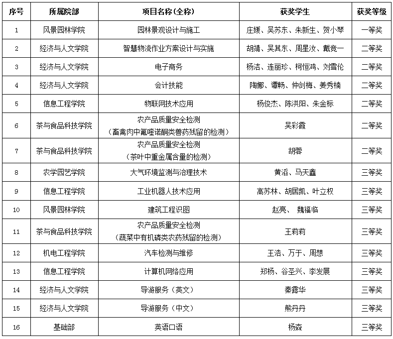 近日,江苏省教育厅公布了2018年江苏省高等职业院校技能大赛获奖名单。本次比赛共设12个专业大类39个比赛项目,我校学生参加了9个大类17个项目,共获得1个一等奖、6个二等奖、9个三等奖,获奖数量位居全省农业类高职院第一。其中我校庄媛、吴苏东、朱新生、贺小琴同学获得园林景观设计与施工项目一等奖(第一名),工业机器人技术应用、大气环境监測与治理技术项目首次参赛即获得奖牌,智慧物流作业方案设计与实施、电子商务、会计技能、物联网技术应用等项目也取得历史最佳成绩。