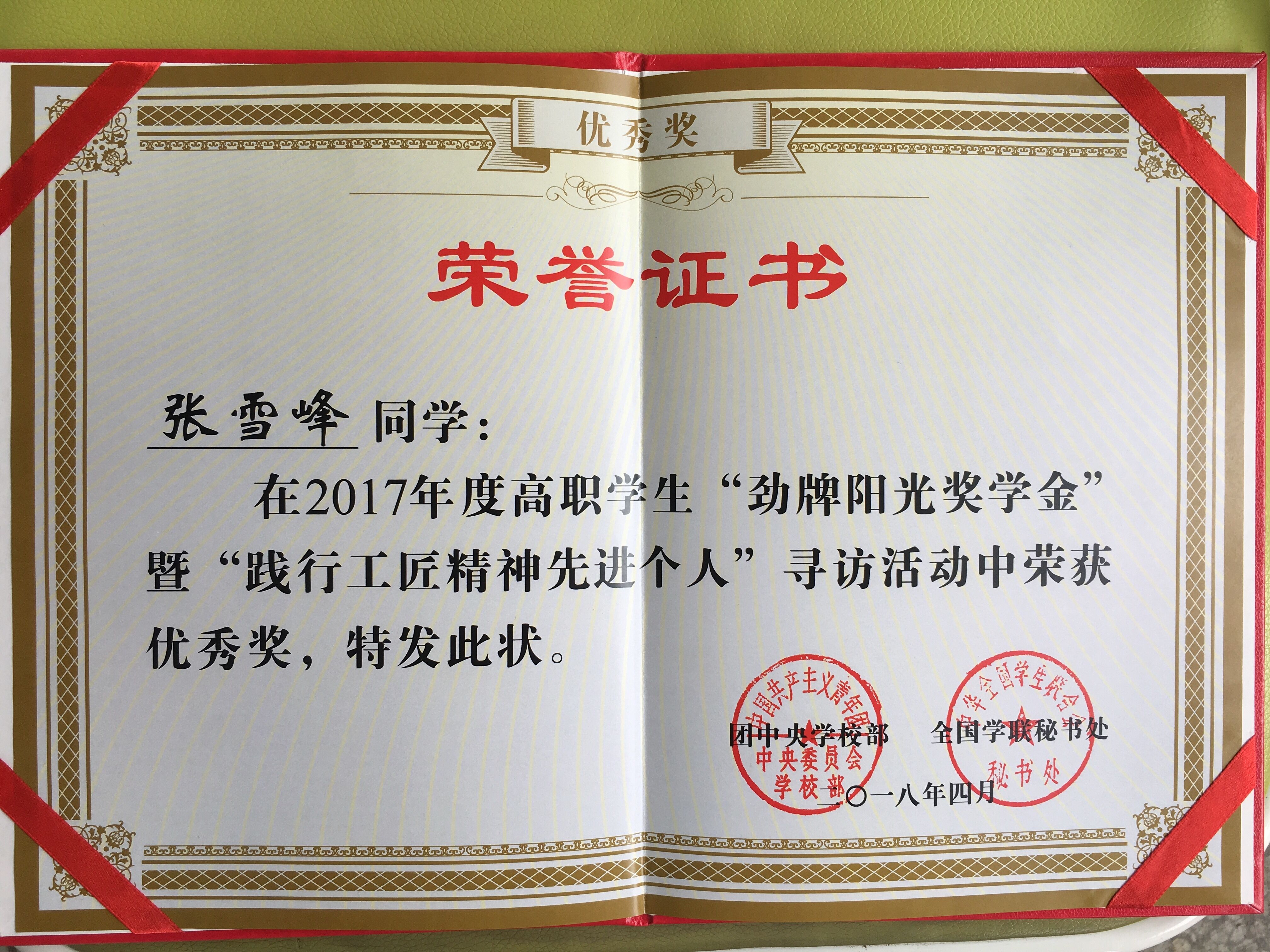 近日,共青团中央学校部公布了2017年度全国高职学生“践行工匠精神先进个人”寻访活动暨“劲牌阳光奖学金”名单,经各级寻访、网络投票和专家评审,我校信息工程学院张雪峰同学荣获“优秀奖”,全省高职院校仅有11名优秀学子获此殊荣。