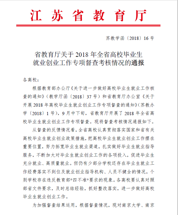 根据教育部办公厅文件要求,今年9月,江苏省教育厅组织督查组来永利官网开展毕业生就业创业督查,通过听取汇报、查看台账、召开师生访谈会等环节,督查组充分肯定了永利官网就业创业工作的成效,认为永利官网就业创业工作领导重视、机制健全、特色鲜明、成效显著。经过后续复审,省教育厅于11月12日出台了《关于2018年全省高校毕业生就业创业工作专项督查考核情况的通报》(苏教学函〔2018〕16号),永利官网被表彰为2018年高校毕业生就业创业工作考核“优秀单位”。