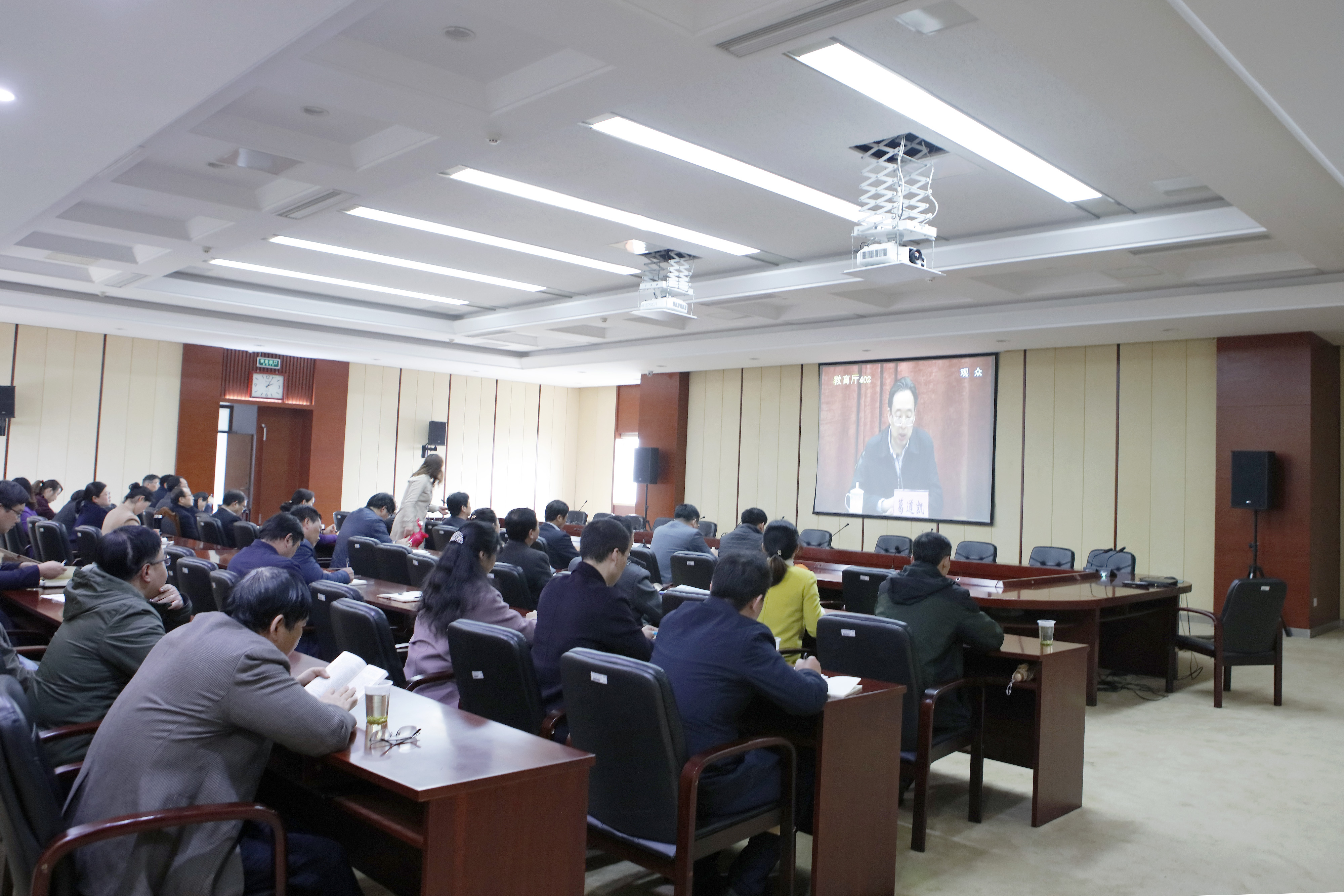 3月28日下午,江苏省教育厅组织召开2019年全省教育系统全面从严治党工作视频会。永利官网党委书记俞卫东、院长巫建华、全体中层干部及纪检监察部门全体人员在9楼会议室分会场收看了视频会。