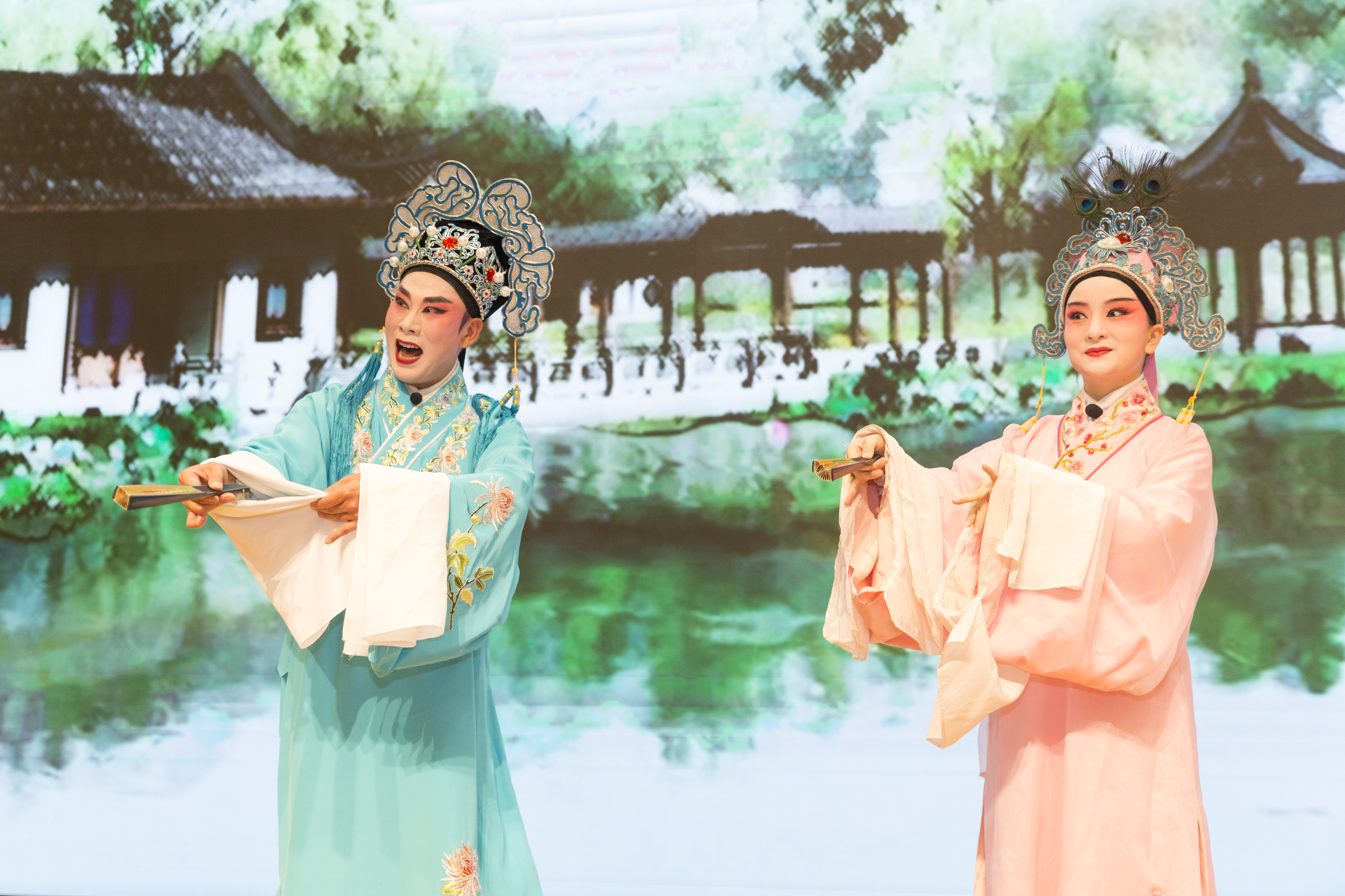 国家一级演员,“梅花奖”得主龚莉莉,国家二级演员周秋生、赵琳琳、葛巧芹等艺术家们带来了《梁祝》《天女散花》《挑女婿》经典扬剧折子戏精彩唱段赏析,一段段荡气回肠的扬剧唱腔,惟妙惟肖的演出,博得在场学子们的阵阵掌声和喝彩。