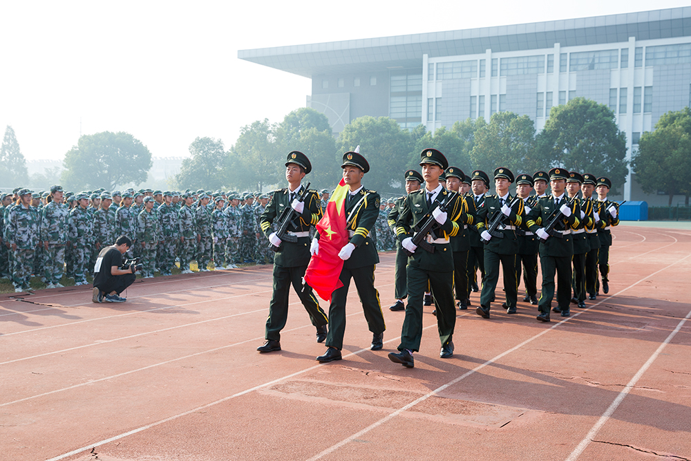 学院国旗护卫队队员迈着铿锵有力的步伐护送国旗走向升旗台。“全体肃立!升国旗,唱国歌……”升旗仪式正式开始。雄浑激昂的《义勇军进行曲》响起,鲜艳的五星红旗迎风展开,全体师生一起高唱国歌,并向国旗行注目礼。