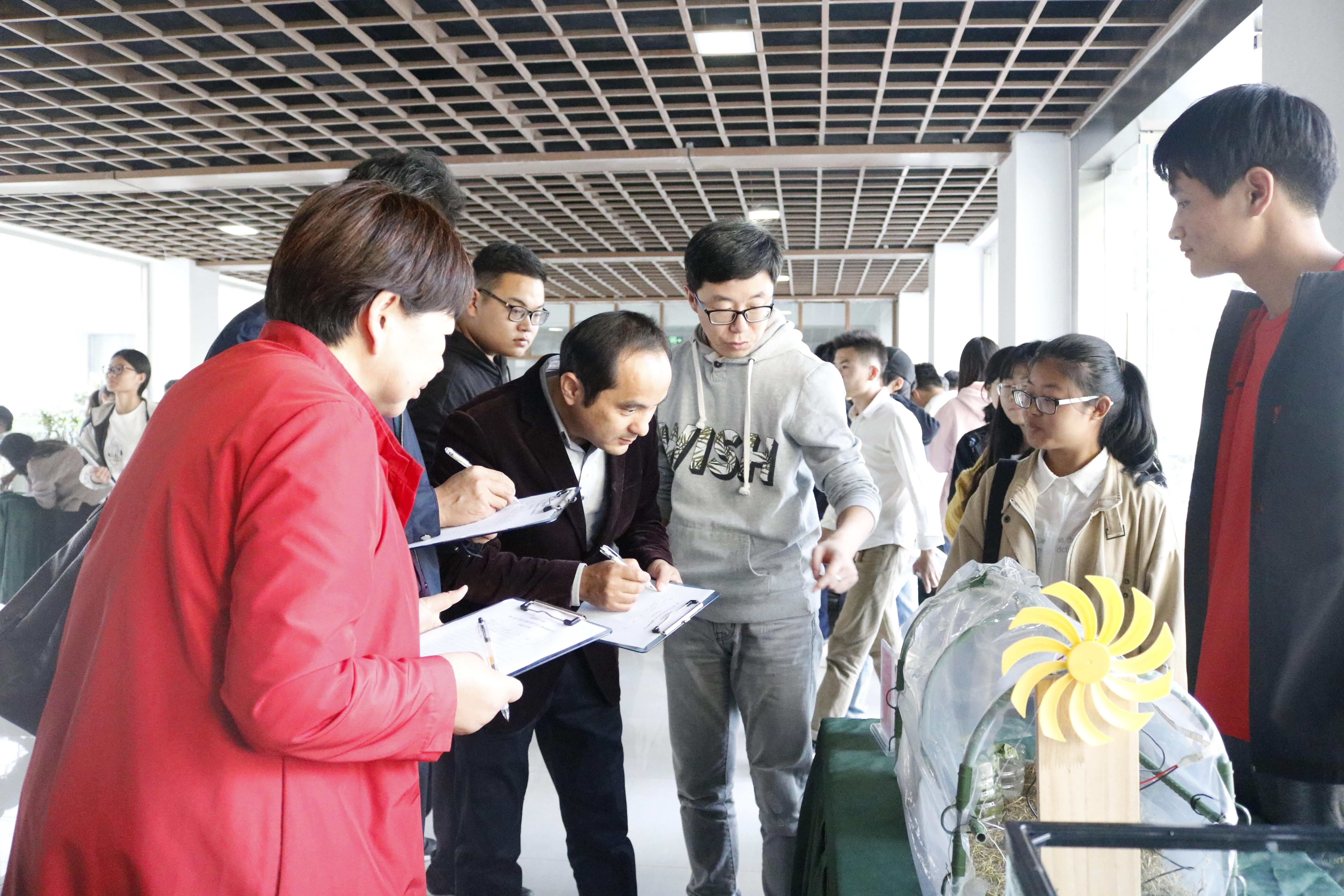 本次大赛共收到25份作品,包括“智能化草莓培育”、“鱼有源头活水来”、“肉室铭”、“风力蓄电大棚种植”等。活动现场桌子上有序摆放着琳琅满目、创意满满的参赛作品。参赛作品外观精美,做工细腻,创意独到,很好的诠释了本次活动的主题,拓展了参赛学生的发散思维和动手实践能力。每一个作品的背后都有着独特的创新立意。从创意点的思考到制作过程和作品完成都凝聚着选手们的点滴汗水。在老师们对作品进行评分时,选手们从作品的“实用性”、“环保性”和“美观性”等方面进行了详细的介绍。经过老师们的讨论评分,最终“一体化黑臭水体修复工艺”、“家庭小农场”、“葡萄无土高架省力化栽培系统”获得一等奖。