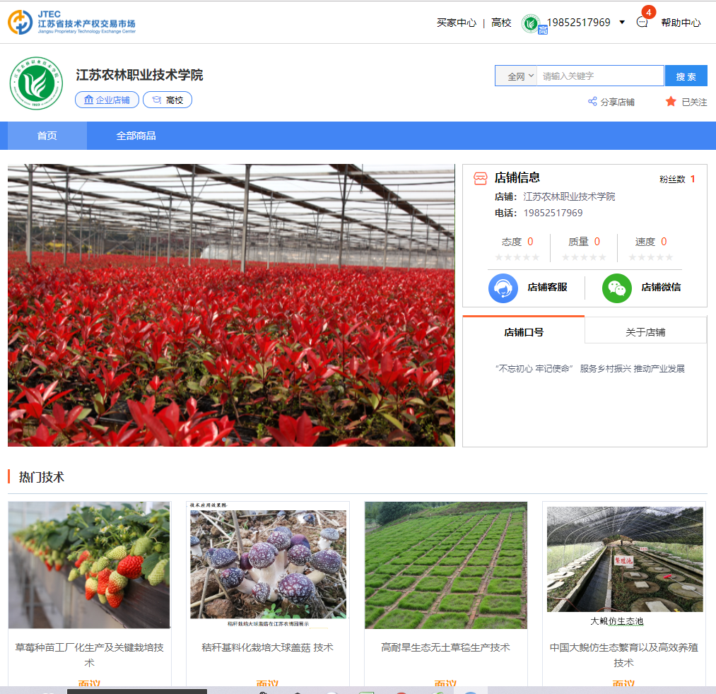 为加快建设和完善我校技术转移体系,推进我校科技成果转化和产业化。根据省高校科技发展中心的统一部署,经过一个多月的组织筹备,成功在江苏省技术产权交易市场上线“77779193永利集团技术产权转化平台”!首批上线项目是2019年9月从农学园艺、畜牧兽医、风景园林、信息工程、机电、茶食、经济与人文等二级学院征集的技术成果,主要包括草坪草、食用菌、草莓、水产等近30项主推技术。平台网址:http://jstec.com.cn/shop?id=201931900829006644