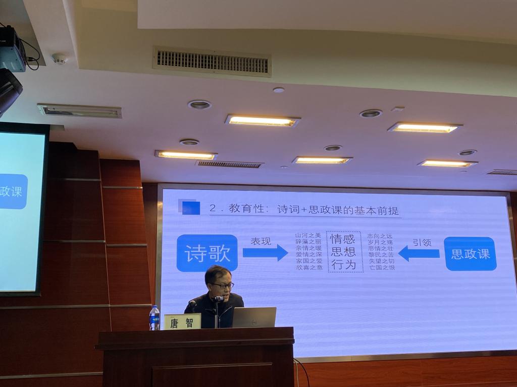 会议主要围绕专家作专题报告、研练式教学法经验介绍、学术交流三方面内容展开。永利官网唐智老师作了《诗词+思政课:理念、实践、问题及其应对》的主题发言,从理论、实践、问题思考三方面发表了促进诗词与思政课相结合的教学观点,最后介绍了我校思政课教学方面唱响“红”的旋律,做好“绿”的文章的具体做法。