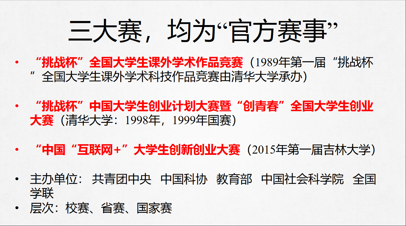 熊富强老师深入浅出的给大家介绍了近几年国内外的创新创业现状,然后详细介绍了中国“互联网+”大学生创新创业大赛、“挑战杯”全国大学生课外学术作品竞赛、“挑战杯”中国大学生创业计划大赛暨“创青春”全国大学生创业大赛等三项国家特别重视的大学生创新创业类大赛的设置、比赛情况以及备赛注意事项。熊老师从带队比赛的角度以及分析一些比较有代表性的作品,让大家更深入的了解了此类比赛。