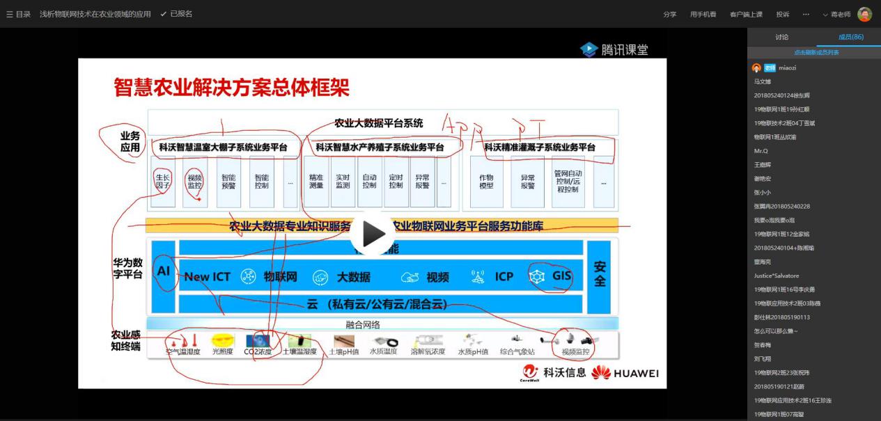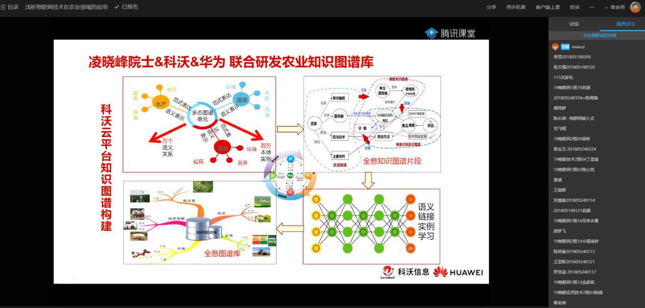 直播课上,苗珍教授带来了丰富详实的行业资料,为师生剖析了智慧农业政策支持、中国农业种植的问题及对策、农业供给侧结构性改革、智慧农业解决方案总体框架、农业大数据平台系统、农业生产过程闭环控制系统流程图等知识,具体讲解了智慧温室大棚主系统等多方面的物联网知识。