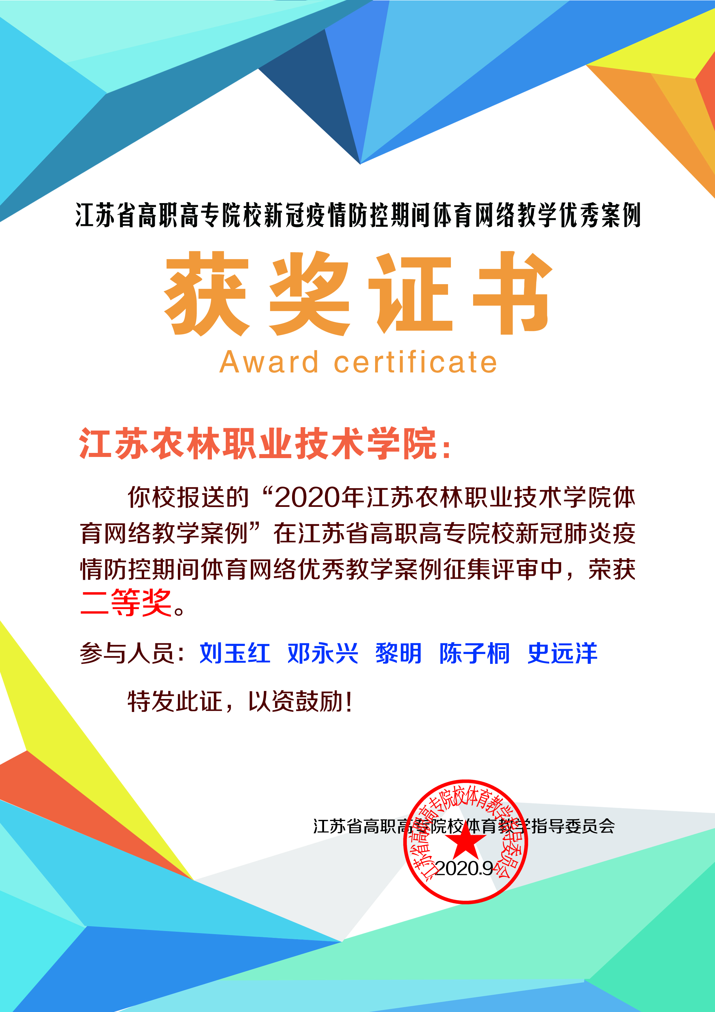 近日,江苏省高职高专体育教学指导委员会公示网络优秀教学案例名单,永利官网教师作品获得网络优秀教学案例二等奖。