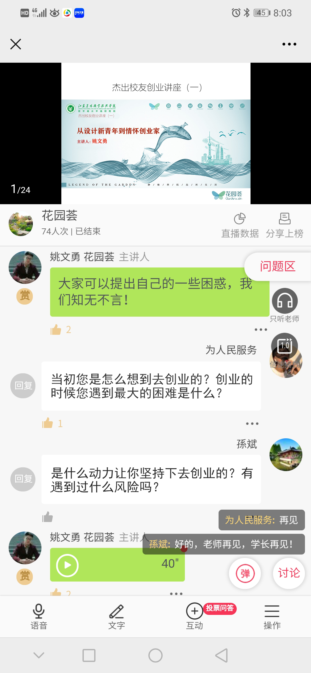 10月27日晚,风景园林学院在直播平台上举办了“从设计新青年到情怀创业家”创业指导讲座,邀请杰出创业校友观樾(上海)工程设计有限公司总经理姚文勇先生主讲,有创业想法的79名同学参加。
