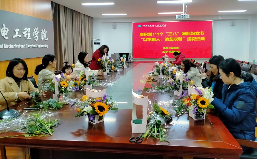 3月5日下午,机电工程学院组织女教职工开展“以花喻人,德艺双馨”插花活动。活动开始前,大家深入学习了张桂梅、王淑芳、李兰娟、夏森、樊锦诗、黄文秀等巾帼们春蚕一般的奉献精神。随后开展了“以花喻人,德艺双馨”插花活动,活动邀请了专业花艺师为教师们量身订制了一节插花课,从花材的配色、主花和辅花的插花方法等方面给予了指导,活动现场香气扑鼻,气氛温馨。