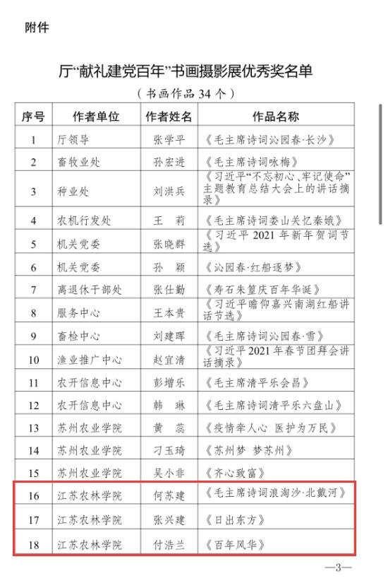 为庆祝中国共产党成立100周年,厅直属工会联合会举办了以“献礼建党百年”为主题的厅机关干部职工书画摄影展。永利官网工会积极组织教职工参与,并推选优秀作品参赛,经过评审组评选,永利官网何苏建、张兴建、傅浩兰、邹阳四位老师获书画展优秀奖,吴林燕老师获摄影展优秀奖。