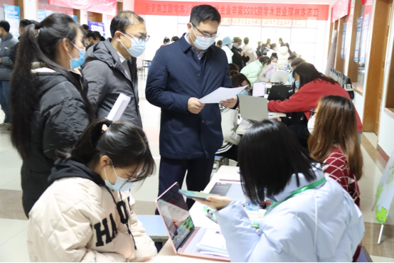 学校和学院领导高度重视此次招聘现场会开展,学校党委副书记曹仁勇莅临现场指导工作,了解用人单位需求。学校党委委员、农学园艺学院院长颜志明和全体辅导员及2022届班主任深入招聘会现场指导学生进行应聘。