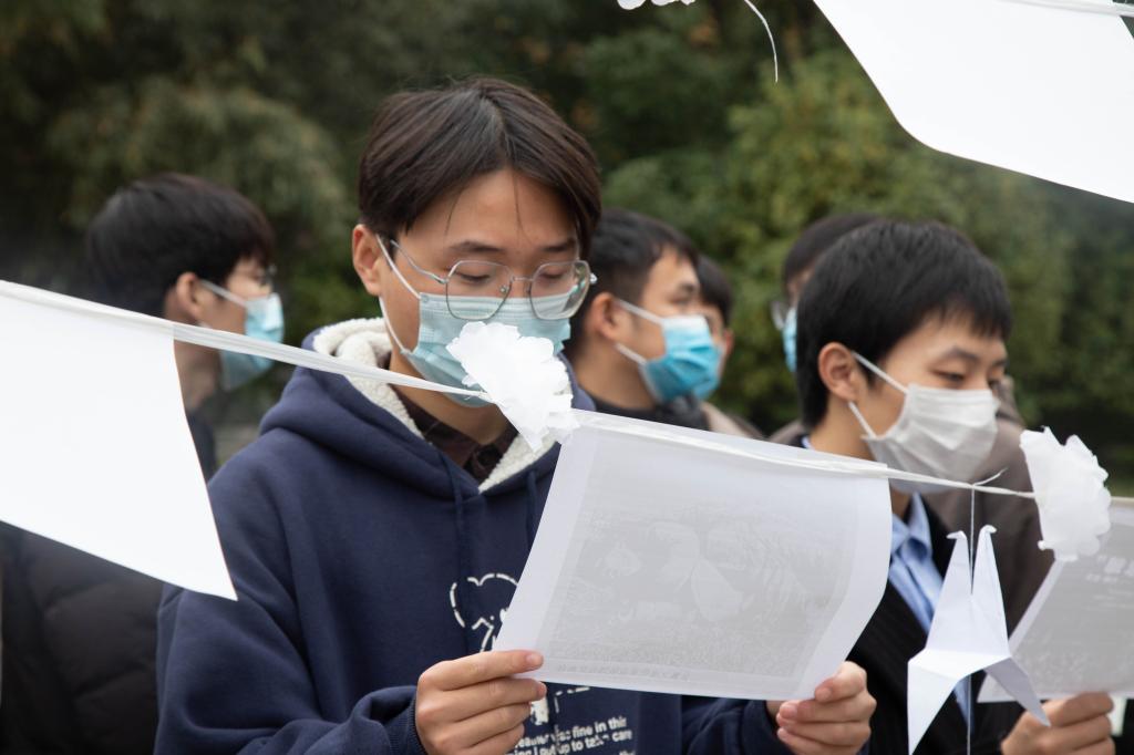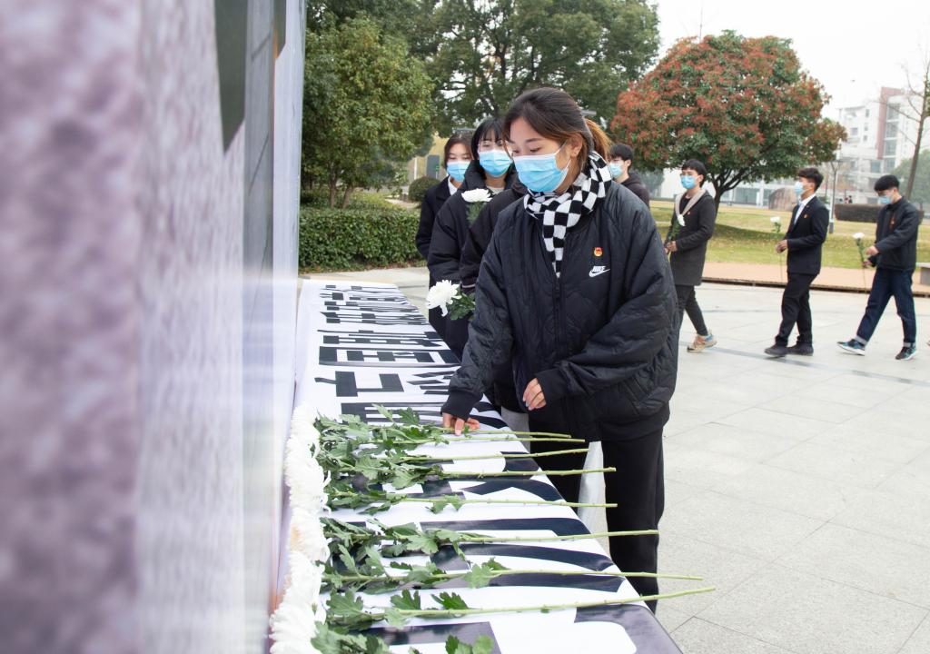 献白菊,折白鹤,寄哀思。随后,同学们为遇难同胞献上白菊,将哀思写在白纸上,折成千纸鹤,千纸鹤在树上随风摆动,寓意着同学们对遇难者的哀悼,对和平的呼唤。夜幕渐起,同学们用蜡烛摆成心形“12.13”的形状,默哀祈祷。