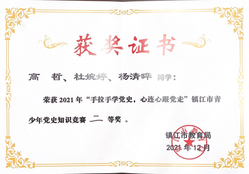 近日,由镇江市青少年党史学习教育指导组主办的“手拉手学党史,心连心跟党走”青少年党史知识竞赛决赛在南山剧场举行,由永利官网高哲、华阳中学杜婉婷、市实验小学杨清晔三位同学组成的大中小学生思政联盟代表队获得比赛二等奖。