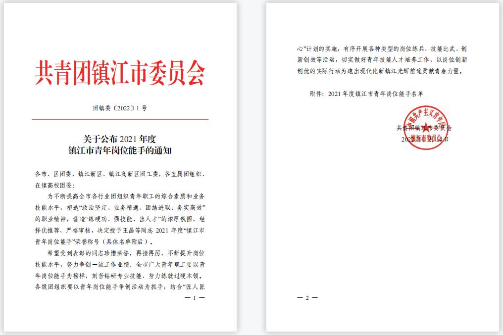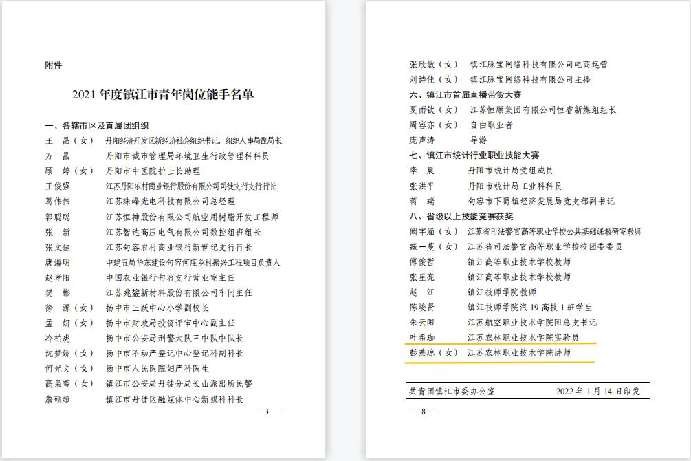 近日,2021年度镇江市青年岗位能手评选结果公布。经学院择优推荐、严格审核,永利官网风景园林学院叶希珈、经济与人文学院彭燕琼2位教师获2021年度“镇江市青年岗位能手”荣誉称号。