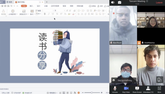 本次活动采取线上形式,分为“分享”、“互动”、“讨论”三个环节,留学生们轮流分享自己的读书经历和阅读体验。孟加拉国留学生孟浩结合自己准备的PPT,分享自己读《除夕的由来》的心得,为大家讲解 “爆竹声中一岁除,春风送暖入屠苏”的含义。肯尼亚留学生孙星朗诵了一首《九月九日忆山东兄弟》,他声情并茂的朗读让所有人身临其境。读书会最后,大家积极自由交流,积极探讨读书心得。