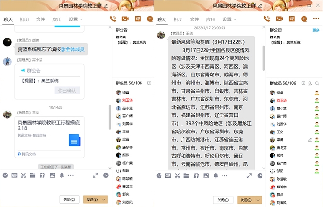 尽责任,显担当,同心战“疫”,应对突如其来的疫情防控,风景园林学院党总支及时成立风景园林学院疫情防控应急领导小组,做到“防疫不疏漏,防疫不妨情,停课不停学,科研生产不停歇”,切实做好师生防疫工作和日常教学科研工作。