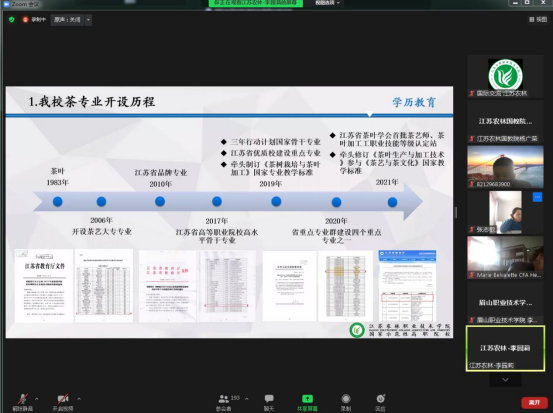 中法农业培训和乡村振兴服务中心建立了疫情背景下线上常态化交流机制,并已开展了多场线上交流活动,本次中法“茶产业”人才培养及产业交流研讨共有贵州农业职业学院、江苏农牧科技职业学院、宜宾职业技术学院、遵义职业技术学院等30多家中法院校的近200名代表参会。