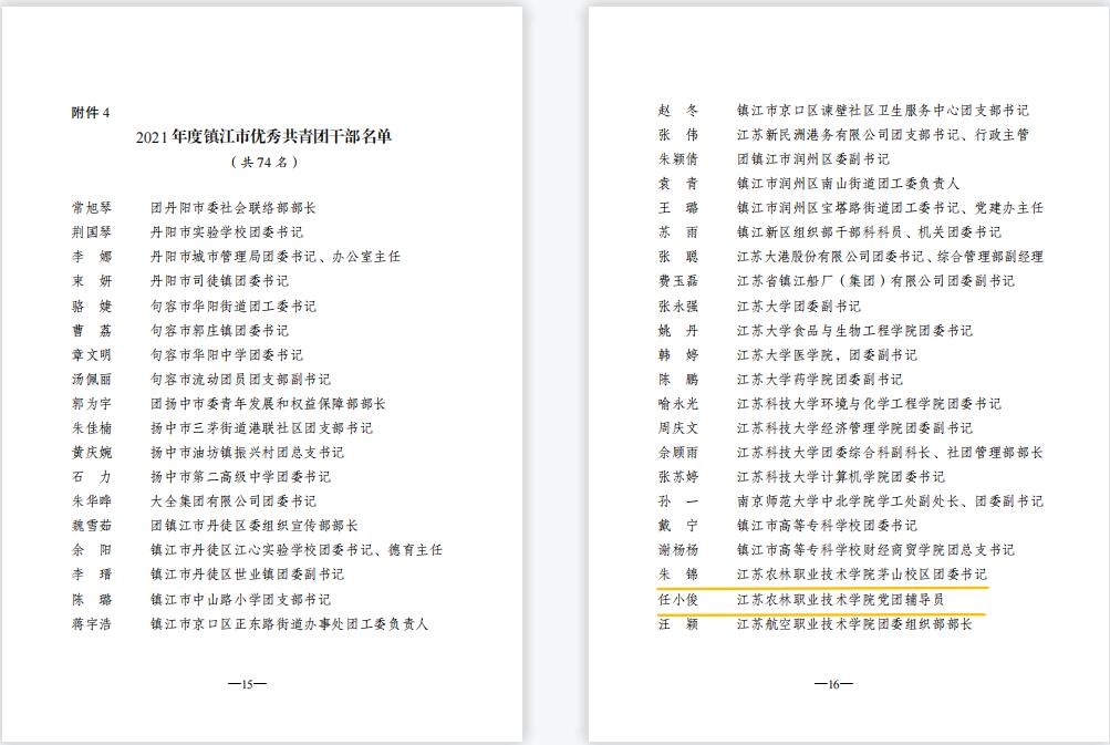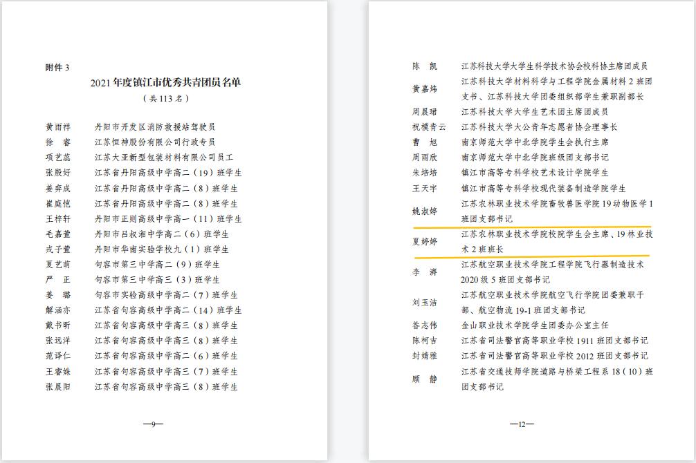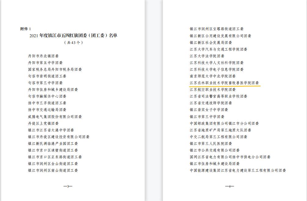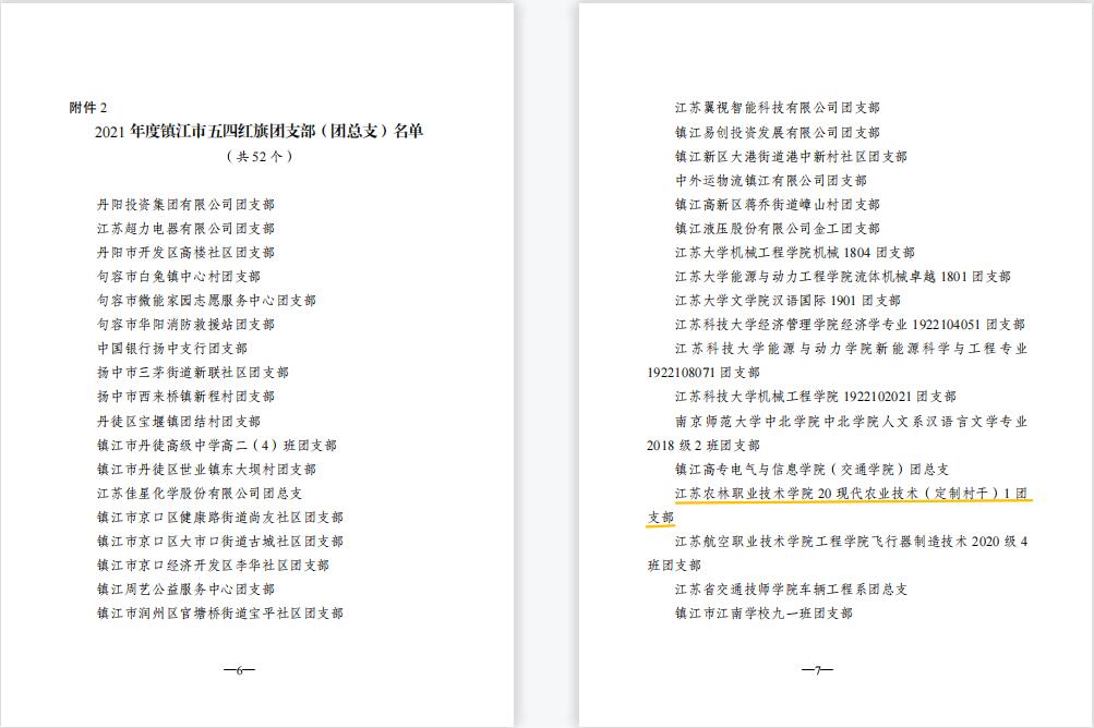 永利官网姚淑婷、夏婷婷2位同学荣获“镇江市优秀共青团员”,朱锦、任小俊2位教师荣获“镇江市优秀共青团干部”,畜牧兽医学院团委荣获“镇江市五四红旗团委”,农学园艺学院20现代农业技术(定制村干)1班团支部荣获“镇江市五四红旗团支部(总支)”。