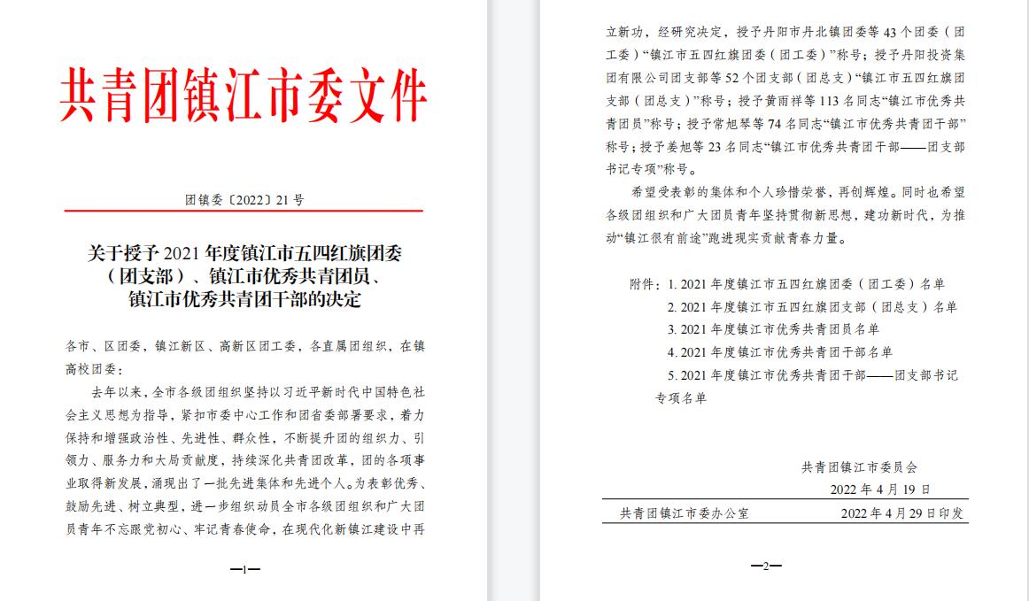 近日,2021年度“镇江市优秀共青团员”、“镇江市优秀共青团干部”、“镇江市五四红旗团委”和“镇江市五四红旗团支部(总支)”评选结果揭晓。