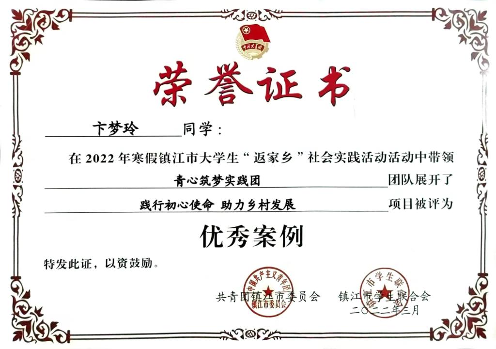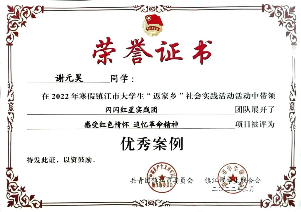 近日,共青团镇江市委员会、镇江市学生联合会公布了2022年寒假镇江市大学生“返家乡”社会实践活动优秀案例名单,永利官网青心筑梦实践团开展的“践行初心使命 助力乡村发展”实践、闪闪红星实践团开展的“感受红色情怀追忆革命精神”实践、青春筑阳服务团开展的“冬日给乡村村民一个温暖的家”实践、“青春行 家乡游 振兴路”实践团队开展的“青春担当 强国有我 以奋斗青春助力乡村振兴”实践等4项目获评2022年寒假镇江市大学生“返家乡”社会实践活动优秀案例。