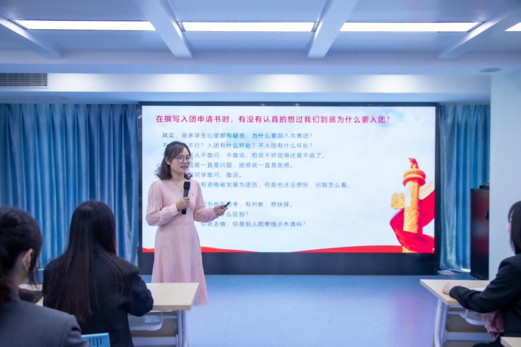 此次培训共设置8个课时。培训会上,团委书记董慧首先带领大家学习了习近平总书记在庆祝中国共产主义青年团成立100周年大会上的重要讲话精神。随后,董老师以“五四运动”为切入点,图文并茂地讲解了五四运动时期的坎坷历程,深入了解五四运动过程中青年革命者的英勇事迹,共同感悟五四运动时期青年积极向上的精神品质。接着,柯永海老师以“青春榜样习近平的知青岁月”为题,张春明老师以“扣好人生‘第一粒扣子’”为题,张欢老师以“革命先驱者的无悔人生”为题,朱锦老师以“争做新时代好团员”为题,袁敏敏老师以“青年,你为什么要入团”为题,刘梅老师以“志愿服务我能行”为题,曾晨老师以“保持团员先进性发挥团员先锋作用”为题,为同学们带来了一堂堂精彩团课。同学们通过系列课程的学习,掌握了共青团的基础知识和共青团的光荣历史,提高了思想政治水平和实践创新能力。
