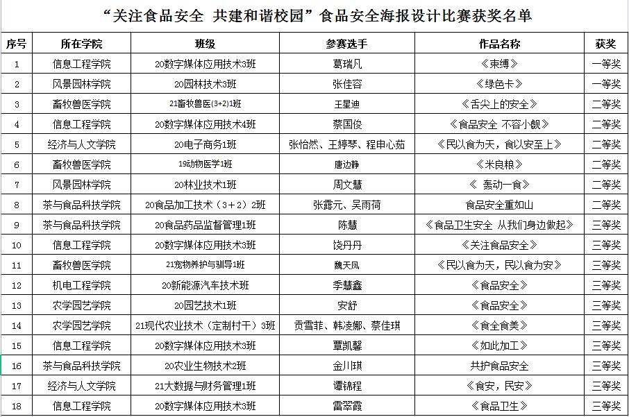 通过各二级学院(校区)团委初评,校级专业评审,微信公众号作品展示投票。最终,20数字媒体应用技术3班葛瑞凡同学的《束缚》、20园林技术3班张佳容同学的《绿色卡》获比赛一等奖;21畜牧兽医(3+2)1班王星迪同学的《舌尖上的安全》、20数字媒体应用技术2班蔡国俊同学的《食品安全不容小觑》等获比赛二等奖;20食品药品监督管理1班陈慧同学的《食品卫生安全 从我们身边做起》、20数字媒体应用技术3班饶丹丹同学的《关注食品安全》等获比赛三等奖。
