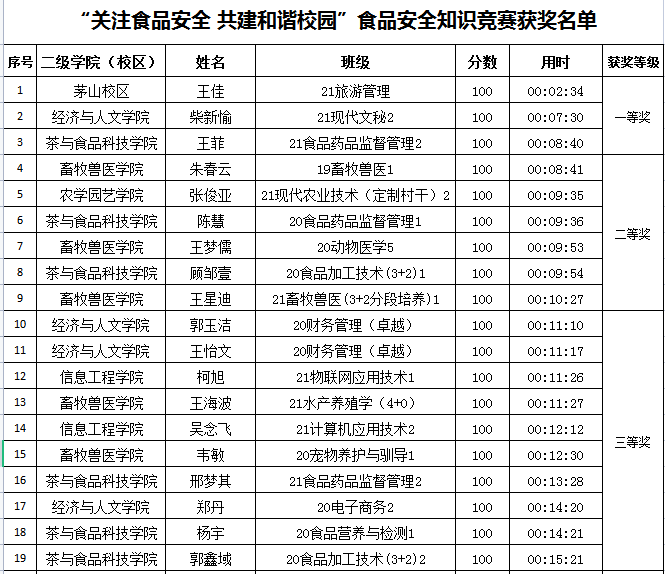 比赛围绕食品安全相关内容,共设置30道单选题和多选题。活动中,同学们积极参与,在限时45分钟内完成所有答题。经过激烈竞答,共角逐出一等奖3名,二等奖6名,三等奖10名,优秀奖30名。