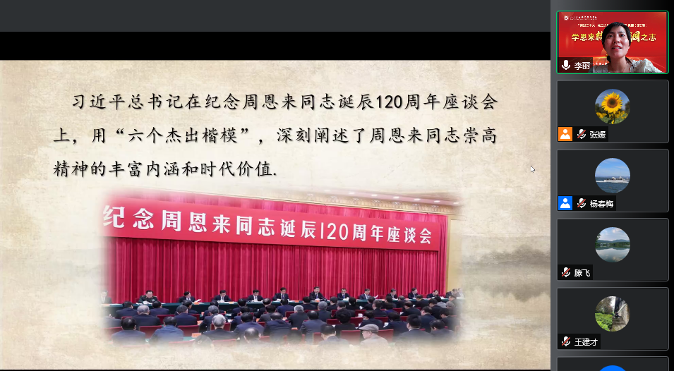 为持续加强党史学习教育,着力推进党史教育常态化。6月22日下午,机关党委组织了“喜迎二十大党史大讲堂”云端系列党课(第二期)活动,邀请组织人事处副处长、副教授李丽作《学恩来精神立报国之志》主题党课,机关党委近140名党员干部参加了本次活动。