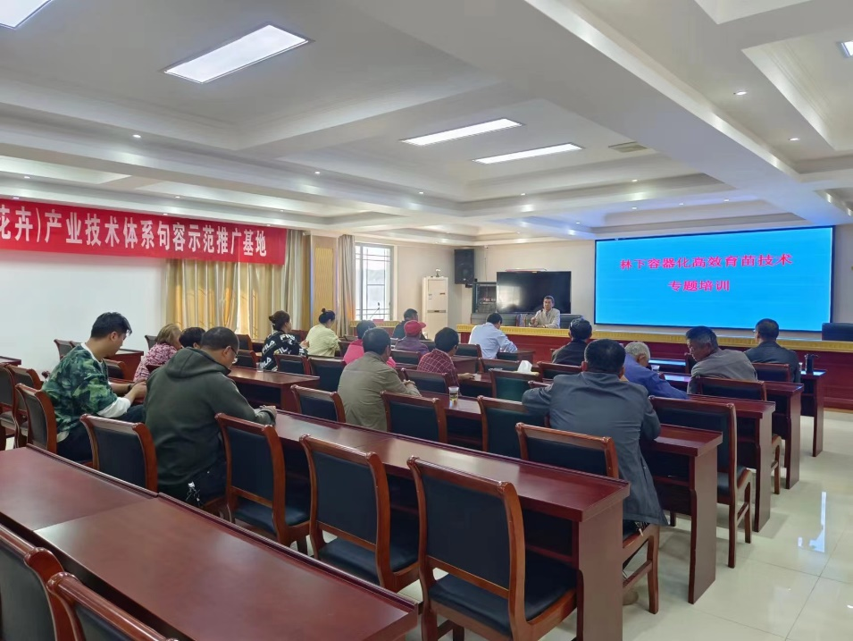 科技服务团队在天王镇唐陵村党群活动中心向示范户做了主推品种的宣传推介,并对容器化育苗的技术要点做了专题培训。专题培训结束后,团队一行来到林下容器化高效育苗示范基地实地调研,与示范基地负责人进行深入交流,了解示范基地和示范点建设情况及技术需求,并在现场进行了技术指导生产。