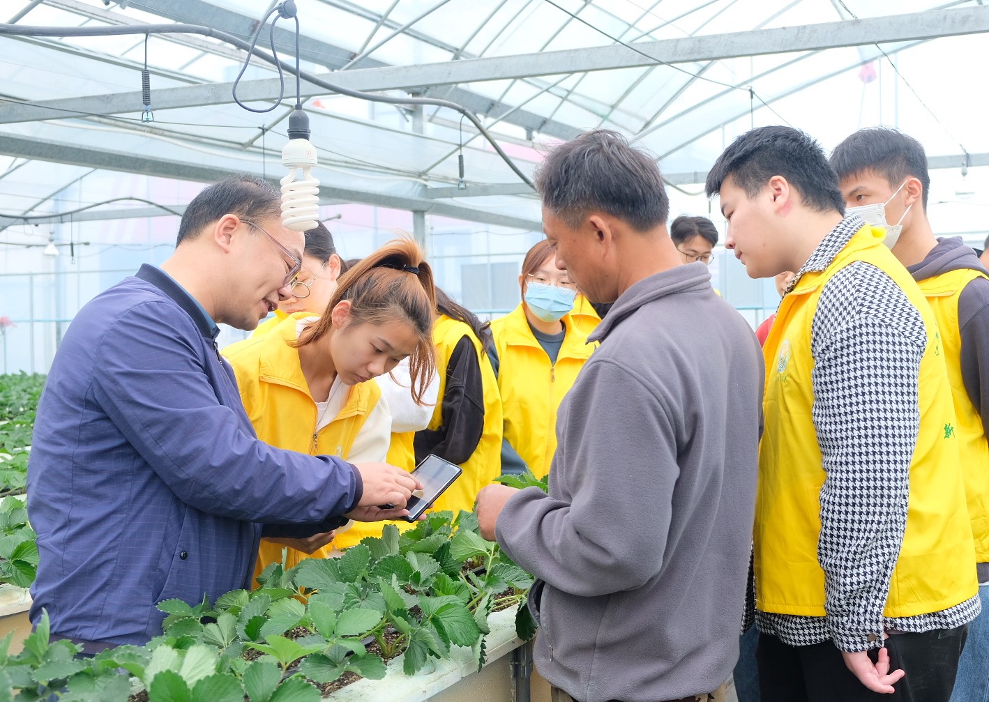 眼下正值草莓种植管理关键期,新禾助农服务团来到全国劳模纪荣喜的家庭农场进行了实地调查,王全智从设施草莓品种特性、省力化栽培意义、基质栽培技术要点等方面就草莓提质增效核心技术,给实践团成员进行了详细讲解分析,服务团还为纪荣喜家庭农场物化了生物农药等物质。全国劳模纪荣喜为同学们讲述了他从事草莓产业艰辛历程,他说:“我一生跟对了一个人——赵亚夫老师,一生中只做了一件事——种草莓,一生中做好一件事——把草莓种好”。他希望同学们要学好专业技能,把技术带回家乡,让技艺有承。服务团成员们认真记录并表示要发挥农科专业学生特长,扎根基层,助力乡村产业振兴。