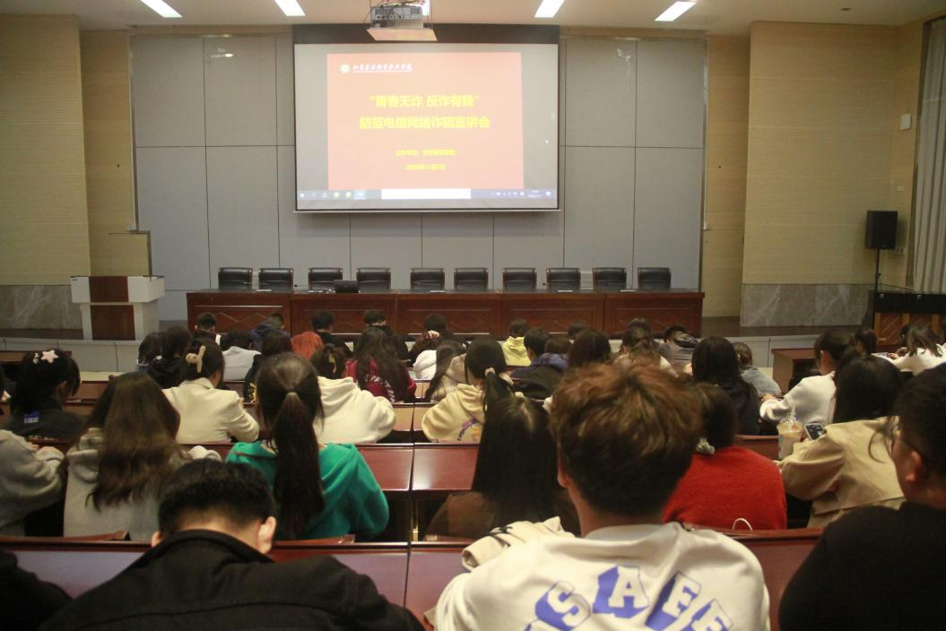为广泛宣传防电信诈骗,提高学生对电信诈骗手法的识别和防范能力,11月7日晚7点,农学园艺学院联合句容市公安局在图书馆报告厅举办“青春无诈,反诈有我”防范电信网络诈骗宣讲会。本次宣讲会同时设立茅山校区、研发楼报告厅、腾讯视频三个分会场,1000余名学生参加。