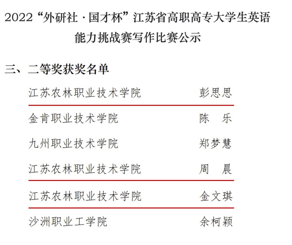 2022“外研社·国才杯”江苏省高职高专大学生英语能力挑战赛写作比赛于11月6日上午举行,此次比赛采用线上比赛形式,不区分公共英语组和英语专业组。经过激烈角逐,永利官网彭思思、周晨和金文琪三名参赛选手在199名选手中脱颖而出,均取得二等奖的优异成绩。