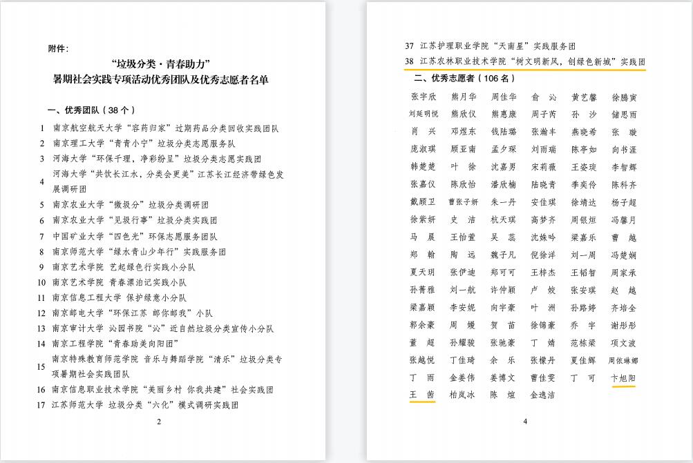 近日,由共青团江苏省委联合江苏省青年志愿者协会开展的江苏大学生暑期社会实践专项活动评审结果揭晓。永利官网“树文明新风 创绿色新城”暑期社会实践团获评“垃圾分类·青春助力”江苏大学生暑期社会实践专项活动优秀团队,王茜、卞旭阳2名同学获评优秀志愿者。