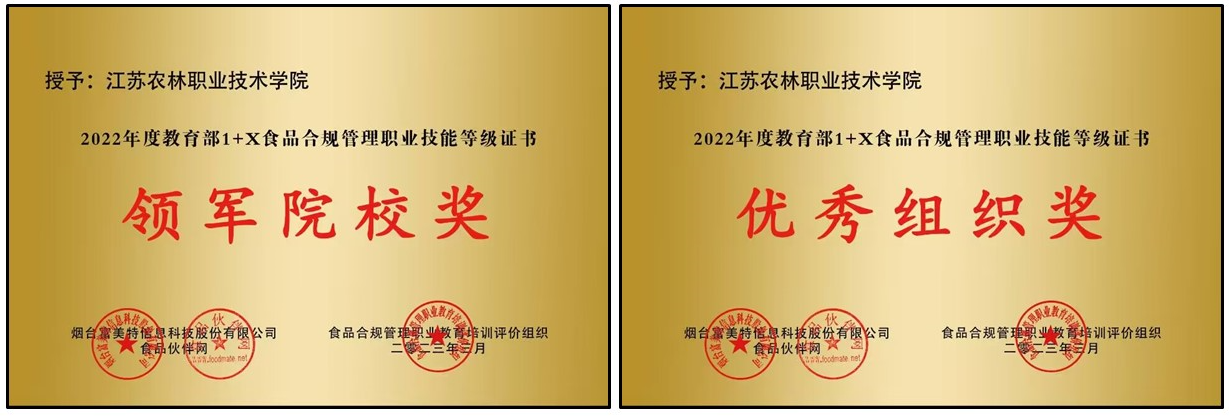 2022年,茶与食品科技学院共计5个专业100名学生参加教育部“1+X”食品合规管理职业技能等级证书(中级)等级考试,通过率为100%。