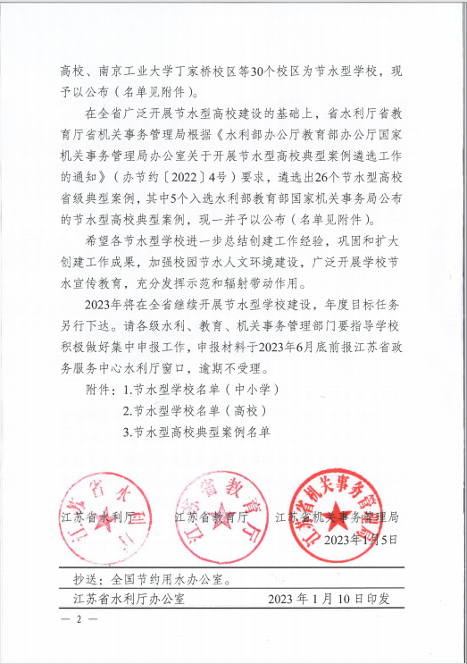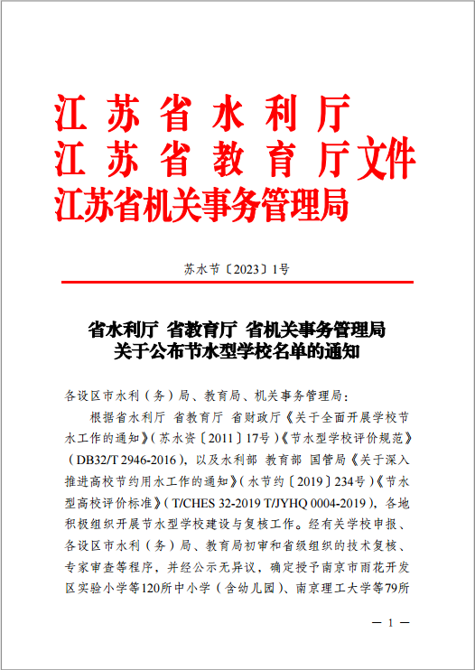 近日,江苏省水利厅、教育厅、机关事务管理局联合发布《关于公布节水型学校名单》的通知,自永利官网于2021年度获评水利部“节水型示范高校”荣誉称号后,于2022年顺利通过复核。