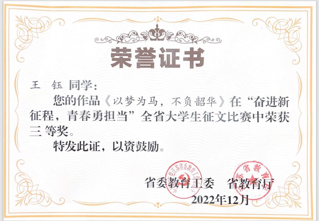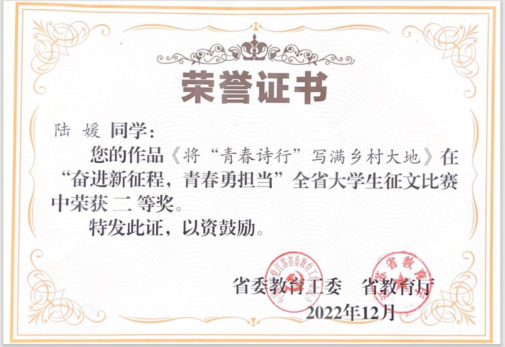 近日,江苏省委教育工委、省教育厅举办的“奋进新征程,青春勇担当”全省大学生征文比赛结果公布。农学园艺学院陆媛、王钰两位同学的作品《将“青春诗行”写满乡村大地》《以梦为马,不负韶华》分别获征文比赛二等奖和三等奖。