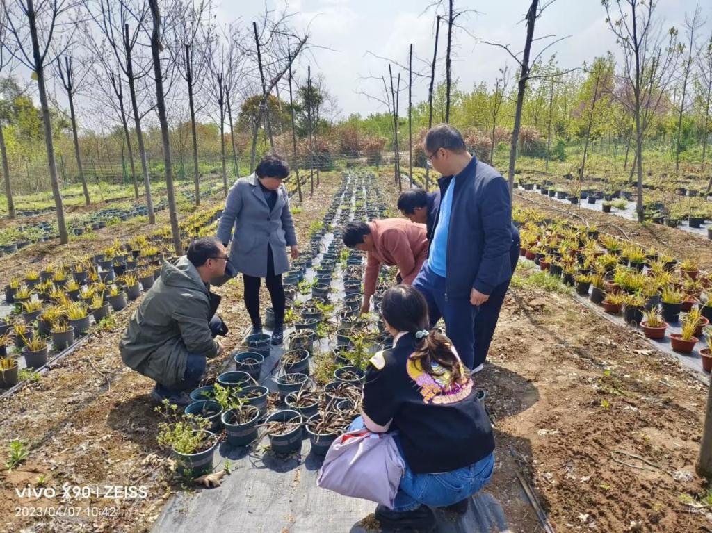 在亚夫科技服务团园林分团唐陵村彩叶苗木示范基地,服务团查看了校地共建示范基地种苗的生长情况,现场指导了彩叶苗木、林下经济盆栽春季维护管养的工作;送去了春季维护的基础农资;对示范基地的下一步建设及技术示范推广进行了现场对接。