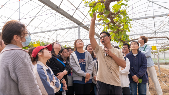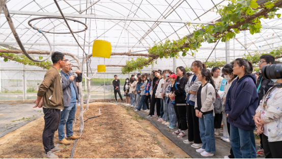 首先,同学们来到学院2019级园艺技术(社招班)毕业生、句容市劳模王建平的东篱家庭农场。他结合自己从事农业创业故事,从农场经营模式、农场种植管理等方面给同学们开展了一场生动的田间思政课。然后,同学们来到了2010届现代园艺专业毕业生岳建涛经营的“新禾”葡萄园,他给同学们讲述了从“新禾”助农服务团到葡萄园承包经营的创业经历和感悟,和同学们开启了“新农人”与“准新农人”的对话。